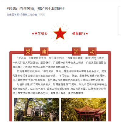 时值全讯建校70周年庆典前夕、附属医院建院70周年、城北校区临床医学等专业搬迁忠山校区,临床医学2017级第二党支部制作忠山校区手绘地图,以及微信公众号线上推文使同学们更多熟悉忠山、更快进入角色、更加热爱学校!