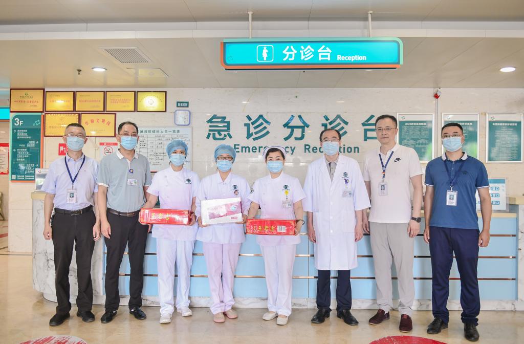为了缓解炎热天气带来的不良影响,为大家带去清凉,8月12日下午,附属医院党委书记徐勇,党委副书记黎靖,副院长王瑛等党政领导,带领党办、院办、工会、宣传·统战部、人力资源部等部门负责人和工作人员,分别走访慰问了忠山院区、康健中心院区急诊医学部、发热门诊、安全保卫部、总务部、基建部、后服中心等一线工作和服务窗口人员,为大家送去了苏打水、凉茶等清凉饮品,以及来自医院最真挚的叮嘱,为这酷暑增添沁人心脾的凉意。