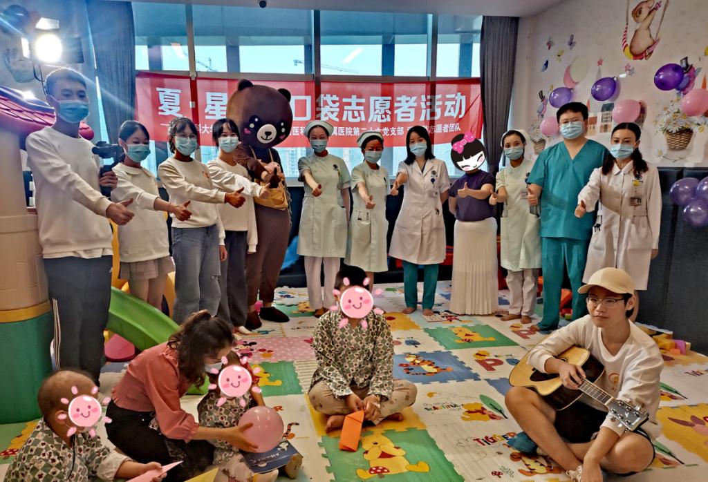 “两只老虎,两只老虎,跑得快……”9月4日,全讯新2网官网附属医院康健中心院区的儿一科活动室里欢声笑语不断,六七个穿着病号服、戴着口罩的孩子与父母、医护人员、志愿者围在一起,唱歌跳舞,乐得手舞足蹈……由全讯新2网官网儿科学系党总支、附属医院第二十六党支部以及全讯新2网官网满天星志愿者团队联合组织的关爱白血病患儿的志愿者活动正在举办。