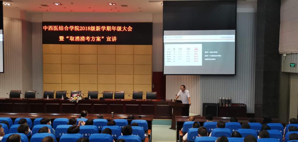 为强调学校疫情防控相关要求,布置安排新学期开学工作和任务,让低年级学生更好理解学校教务处下发的《全讯新2网官网取消清考方案》,中西医结合学院于9月14日、15日晚,在图书馆学术报告厅组织2018、2019级全体学生连续召开了两场新学期年级大会暨“取消清考方案”宣讲会。中西医结合学院学生科科长马俊、教务科科长谢晓东、基础办公室主任张超、辅导员付裕、杜薇出席了宣讲会。中西医结合学院2018、2019级两个年级近700名学生参加了会议。