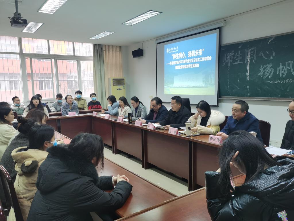 12月28日下午,外国语学院在荟文楼2-11会议室召开2021届毕业生就业工作推进会。此次会议主题为“师生同心,扬帆未来”,学院全体党政领导、8名参加帮扶结对的老师和2021届英语专业全体毕业生到会,学生科科长刘烨主持会议。