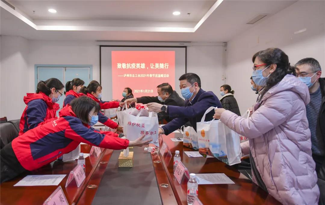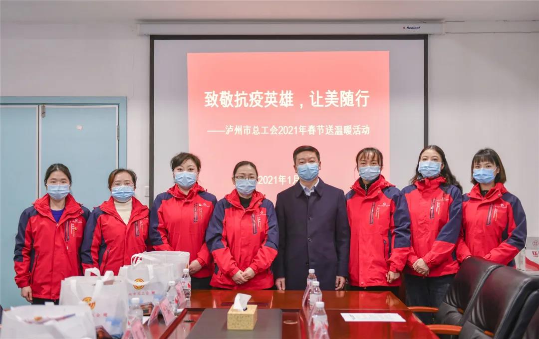 1月21日上午,泸州市委常委、统战部长、市总工会主席付小平,市总工会党组书记、常务副主席钟华贵,市总工会党组成员、副主席邵怡,全讯新2网官网工会副主席陈先红等到附属医院开展“致敬抗疫英雄,让美随行”春节前送温暖慰问抗疫医护人员活动。