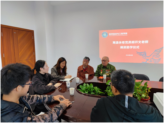 10月23日,捐资助学仪式在文渊楼医学信息与工程学院315会议室举行,胡老和夫人周丽君老师、学院党总支书记杨继宏、党总支副书记刘玉清、学生科科长万江中、两名受助学生参加了此次仪式。