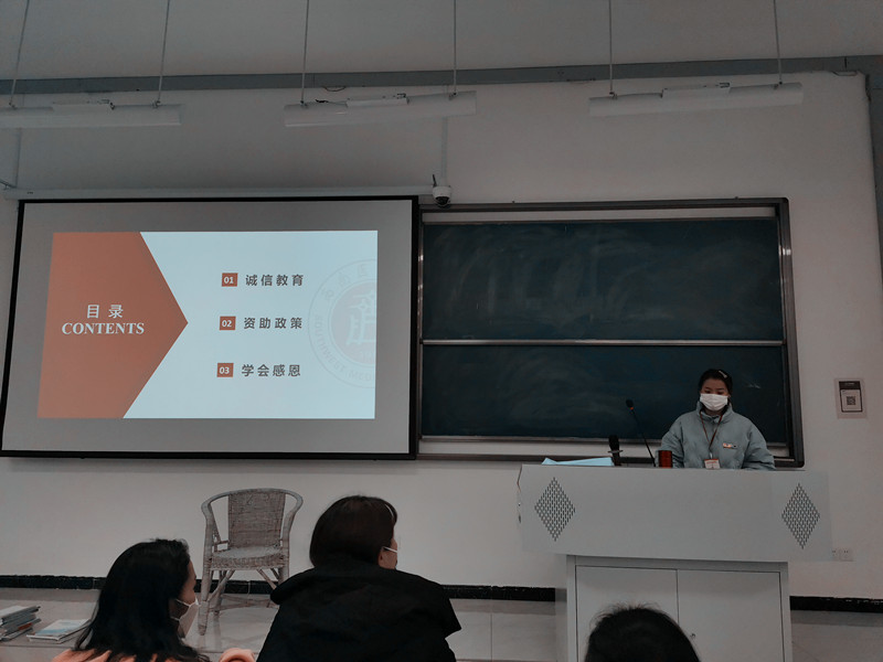 会议伊始,何雪讲解了诚信的基本内容,强调懂得诚信是做人的基本准则。希望同学们要牢固树立守信为荣、失信可耻的道德观念。随后,介绍高等学校学生资助政策,从资助体系、资助标准、申请条件三个方面进行了详细地讲解;她引导同学们感恩所有帮助自己的人,积极投入学习实践,回报感恩之心。最后,全体人员共同观看了《与梦同行》国家资助政策宣传推广片,认识到资助政策的重要性,学会感恩党、国家和社会。