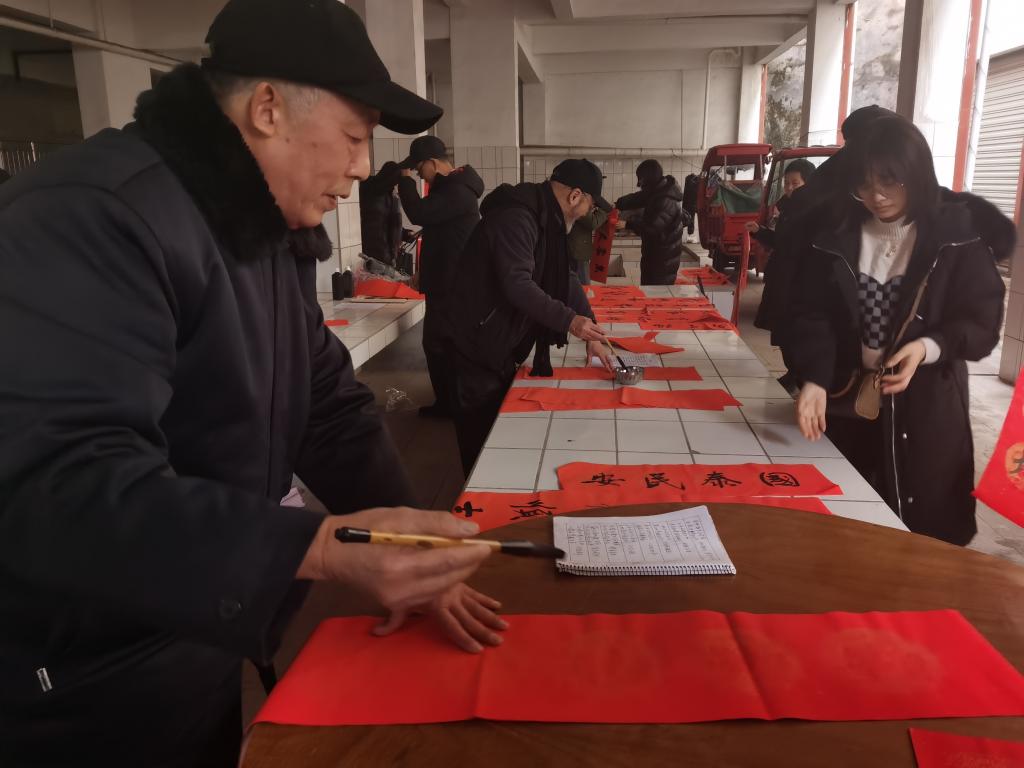 心中有温情,笔端流暖意,书法家们用艺术在农贸市场免费为村民写春联、送祝福。活动现场,书法家们个个满怀热情,挥毫泼墨如行云流水,行、隶、楷等多种字体各显神韵,一副副春联透露着新春的喜庆,一个个“福”字满载着平安吉祥的祝福,居民们挑选着称心如意的春联,喜笑颜开,赞不绝口,现场一派热闹、祥和景象,“年”味十足。