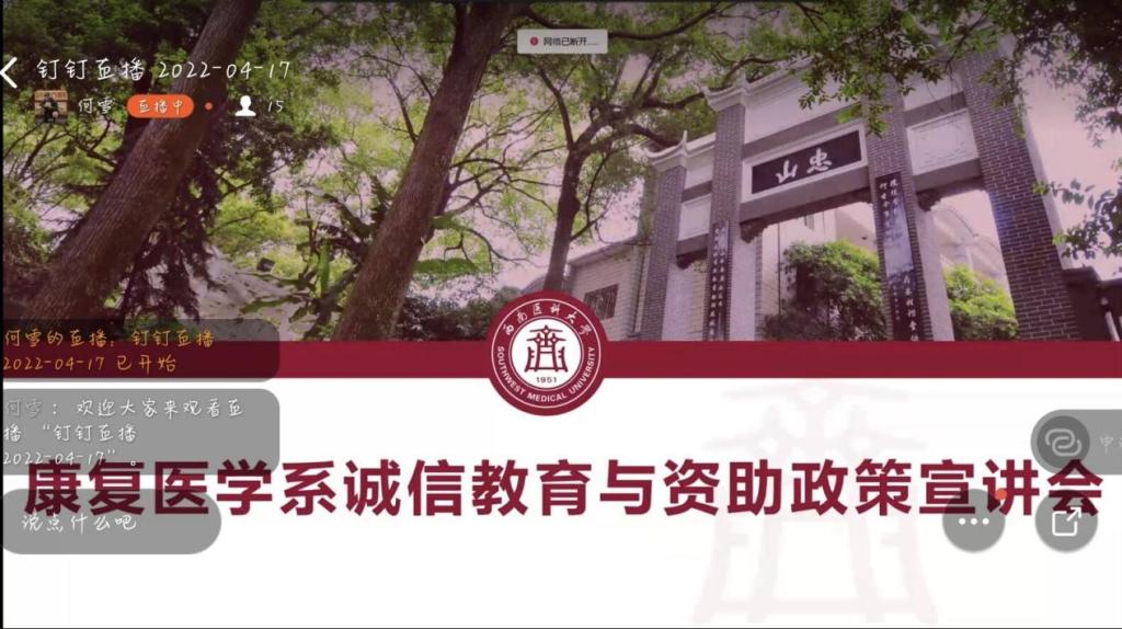 为了帮助学生进一步了解资助政策,做好资助育人工作,4月17日,康复医学系在钉钉平台召开资助政策宣讲会。康复医学系全体受助学生参加会议,会议由学生科辅导员何雪主持。