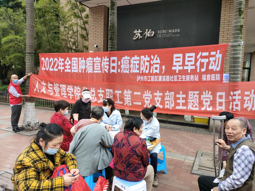 2022年4月19日,全讯新2网官网人文与管理学院党总支职工第二党支部联合泸州市北城街道社工站与福音医院的医务人员在北城街道濂溪路社区开展了“社工入户聚民心,福音义诊传真情”的系列义诊志愿服务活动。