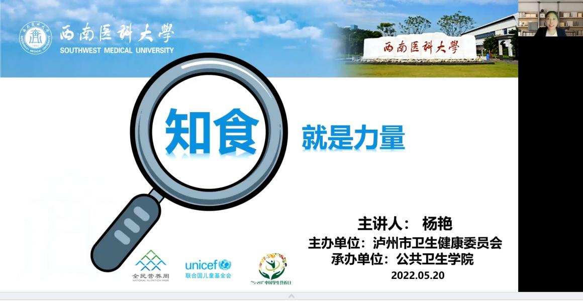 为贯彻落实2022年全民营养周暨“5•20”中国学生营养日—“知营养 会运动 防肥胖 促健康”的活动主题,市卫生健康委员会联合全讯新2网官网公共卫生学院,于5月20日晚,面向泸州市龙马潭区、江阳区公立初中及小学学生与家长,经腾讯会议APP网络研讨会功能,开展了以“知营养 会运动”为主题的线上会议,观看人数达五百余人。