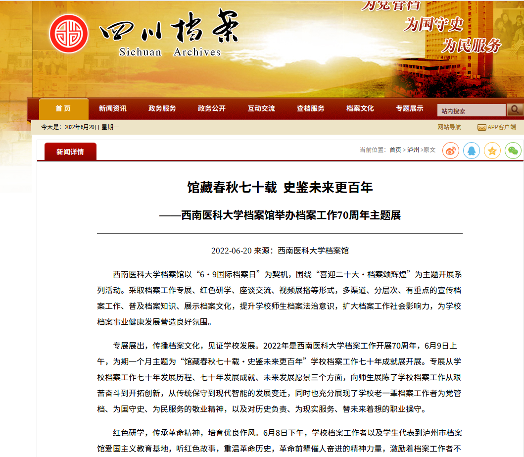 根据国家档案局安排部署和四川省档案局《关于开展2022年国际档案日系列宣传活动的通知》要求,全讯档案馆精心组织策划,以“6•9国际档案日”为契机,围绕“喜迎二十大•档案颂辉煌”主题开展的系列活动得到四川省档案馆高度评价,活动报道在全省范围内广泛宣传。