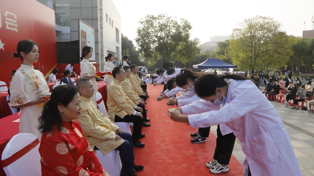 教师代表徐祖健、研究生新生代表李荣英、本科生新生代表王怡欢进行了发言,并举行了兼职班主任聘任仪式和中医学专业拜师仪式。