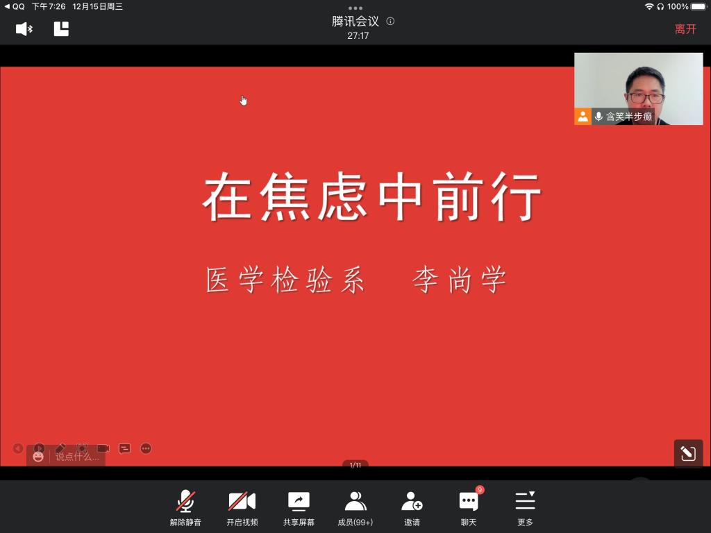 为进一步做好学生考前心理调适,化解考试焦虑,12月15日晚,医学检验系通过腾讯会议线上举办“在焦虑中前行”心理健康教育主题讲座,医学检验系四个年级400余名学生参与讲座,由学生科李尚学老师主讲。
