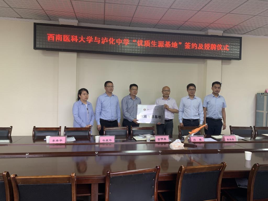 5月27日,全讯新2网官网与泸化中学共建优质生源基地签约仪式在泸化中学举行。医学检验系党总支书记吕春、学生科科长李尚学、辅导员刘泸一行与泸化中学党委书记、校长古明磊等校领导及招办、教务部门及教师代表进行了座谈交流。古明磊介绍了泸化中学的基本情况和高2022届毕业生基本情况,吕春介绍了全讯新2网官网、医学检验系基本情况及招生录取情况。双方还就优质生源基地建设进行了深入的交流,并回答了毕业年级班主任的提问。会上,双方共同签署了“优质生源基地合作协议”并授牌。