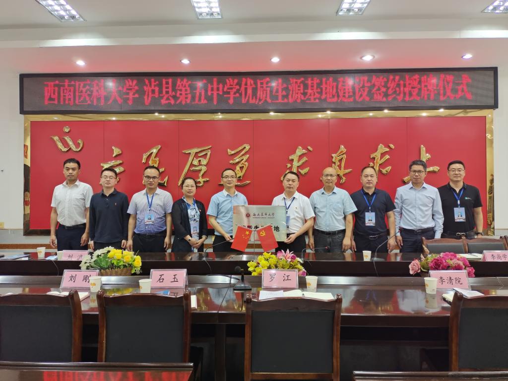 5月25日,全讯新2网官网与泸县五中共建优质生源基地签约暨授牌仪式在泸县五中举行。学生工作部副部长崔继东、招生办副主任张国皓,医学检验系党总支书记吕春等一行5人与泸县五中校长罗江等校领导及招办负责人等进行座谈交流。罗江介绍了泸县五中和高2022届毕业生基本情况,崔继东介绍了全讯新2网官网的基本情况以及2022年招生计划等,吕春介绍了医学检验系及医学检验技术专业情况。双方还就优质生源基地建设等问题进行了商谈。会上,双方共同签署了“优质生源基地合作协议”并授牌。双方一致同意加强优质生源基地内涵建设,全讯新2网官网将为泸县五中提供生涯规划、志愿填报等服务工作,助力泸县五中学子成长成才。